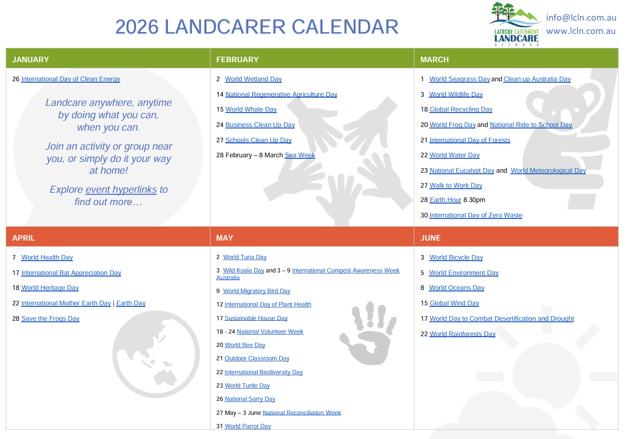 We know life’s busy and you can’t be in all places at once, so we’ve created this annual calendar of recurring environmental events for you to printout or save to your desktop.